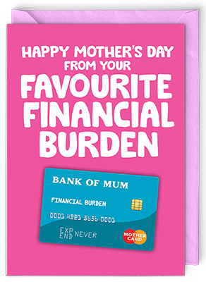 Celebrate mum with a cheeky grin on Mother's Day! This A5 card features a vibrant pink background with a bold, illustrated bank card reading "Bank Of Mum - Mother Card - Expires Never." The playful message "Happy Mother's Day from your favourite financial burden" delivers the perfect blend of humour and heart. Bright, eye-catching colours make it impossible to miss, while the blank inside gives you space for your own personal touch. A hilarious gift for the mum who appreciates a good laugh.
